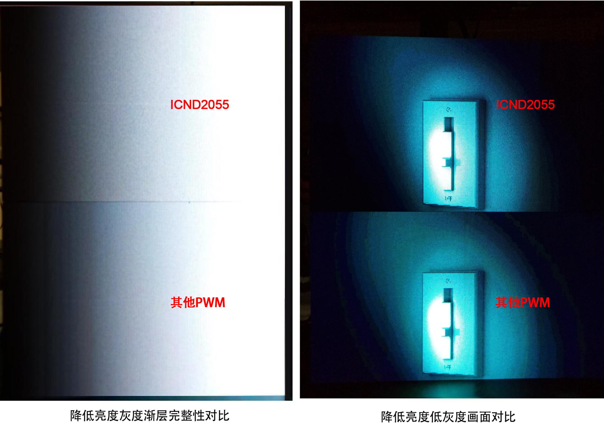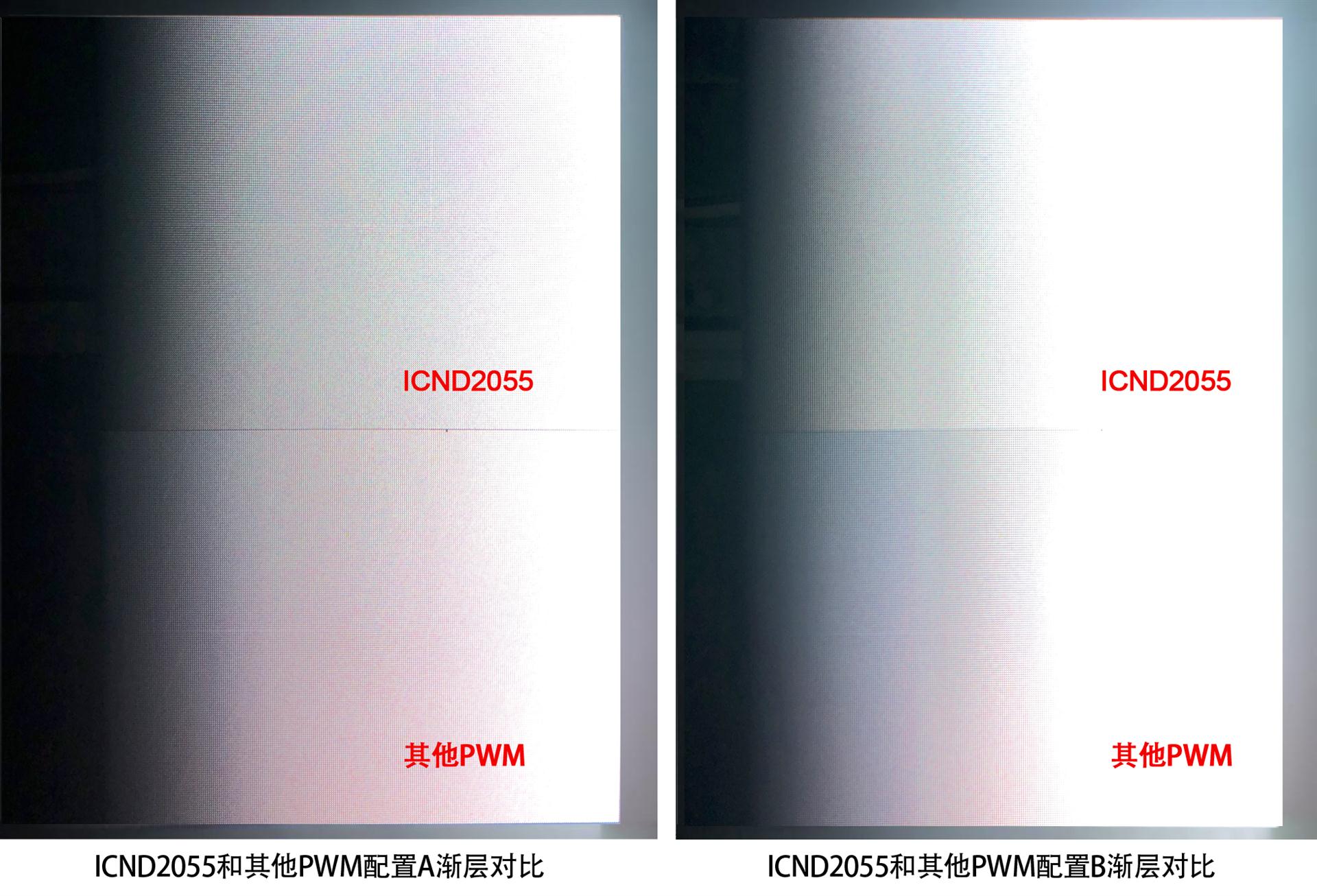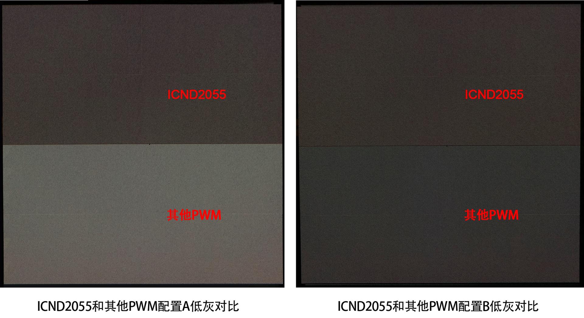 a. ICND2055同其他PWM為1920Hz,13bit的配置條件下時ICND2055對比度更高,低灰更暗;