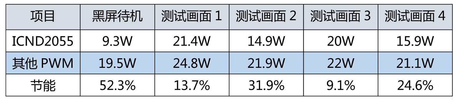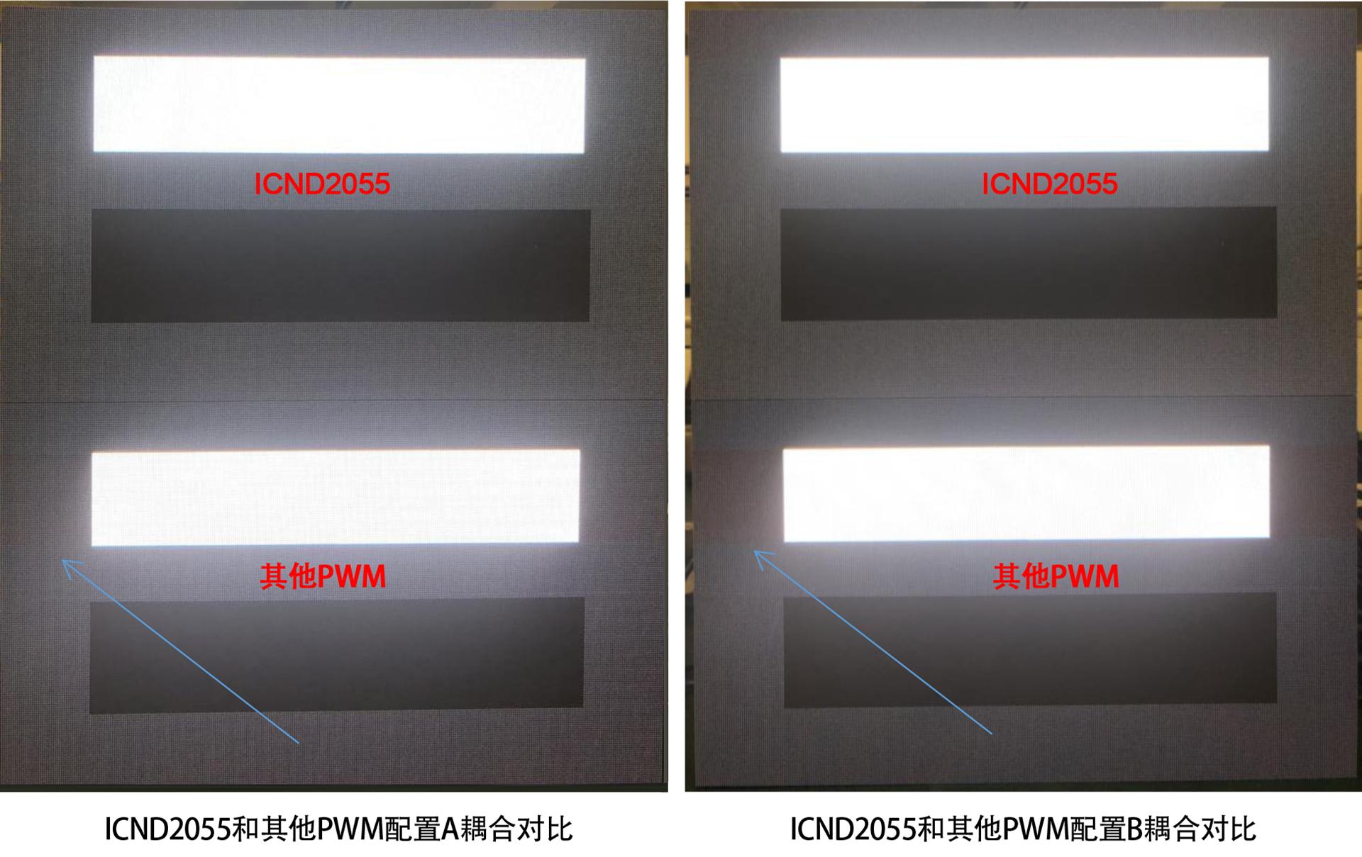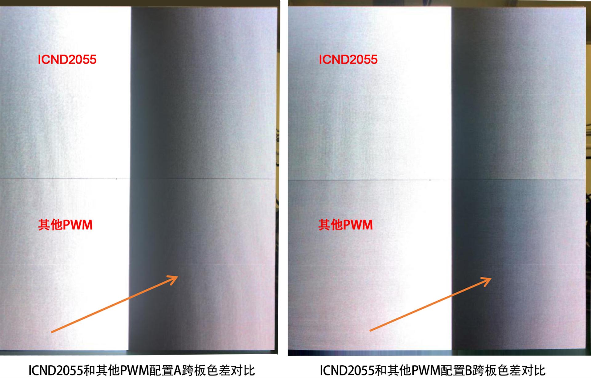 a. ICND2055同其他PWM為1920Hz,13bit的配置條件下時ICND2055對比度更高,低灰更暗;