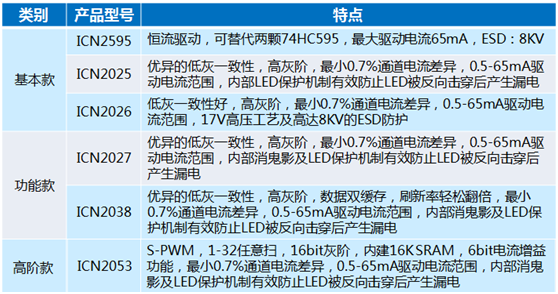 集創(chuàng)還先后推出了ICN2025、ICN2027、ICN2038、ICN2012、ICN2053等新產(chǎn)品,形成了高、中、低端全面覆蓋的LED顯示產(chǎn)品組合。其中ICN2053是小間距LED顯示屏恒流驅(qū)動器的首選,它專為1/32掃以內(nèi)掃描屏設(shè)計的內(nèi)建SPWM及16K SRAM恒流驅(qū)動器,具有高精度寬范圍電流輸出,14Bit PWM灰階控制,內(nèi)建鬼影消除電路、LED保護(hù)電路及6位電流增益功能。
